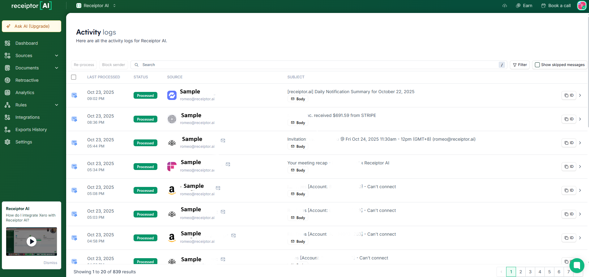 The Activity Logs provide a detailed record of all messages that have been processed by Receiptor AI (emails, WhatsApp messages, uploads).