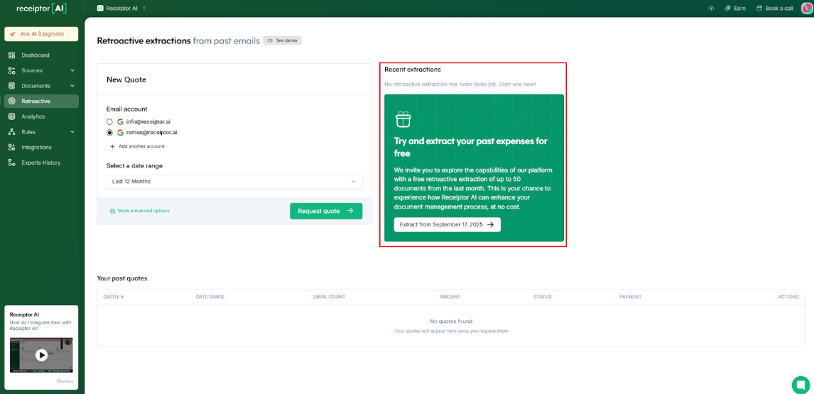 A: Yes! You can watch our interactive video demo for a complete walkthrough of Receiptor AI’s features and workflow. The demo gives you a quick overview of how to connect your inbox, run extractions, and automate document exports all in under 3 minutes.