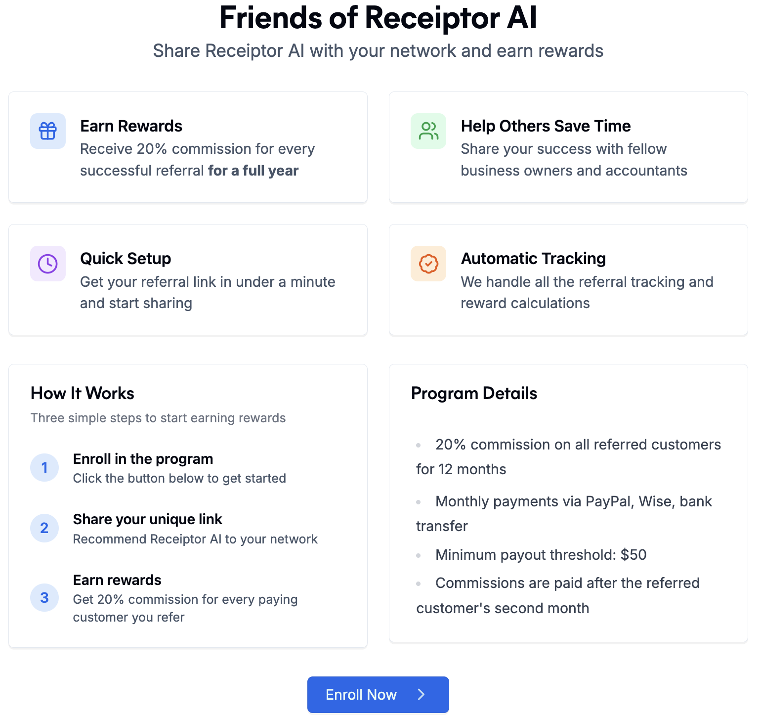 Receiptor AI’s Referrals program lets you share the power of automated receipt management with your friends, colleagues, or clients and get rewarded when they subscribe.