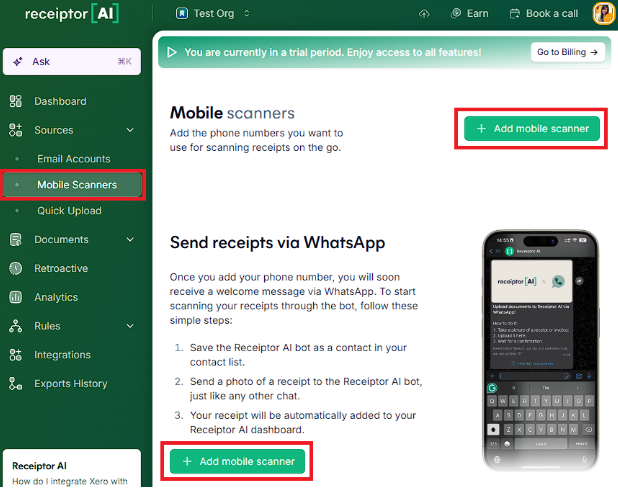 Before setting up your WhatsApp mobile scanner, make sure you’re subscribed to one of our plans (or on a free trial), each of which includes a different number of mobile scanners you can add.