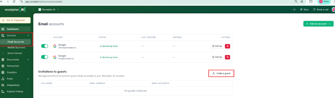 Navigate to the ‘Sources’ > ‘Email Accounts’ section and select the ‘Invite a guest’ option to begin the process. Add your guest’s email address.