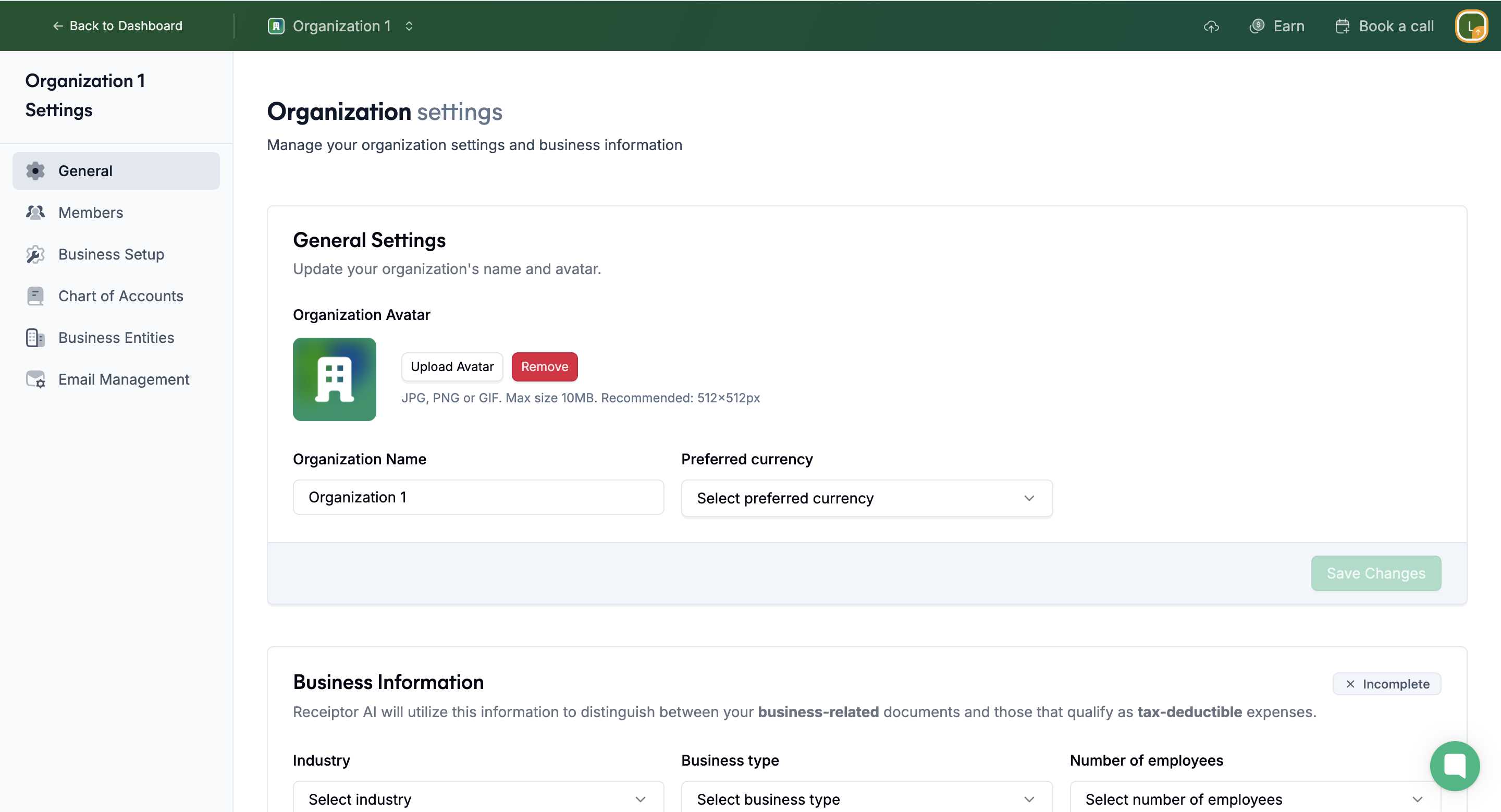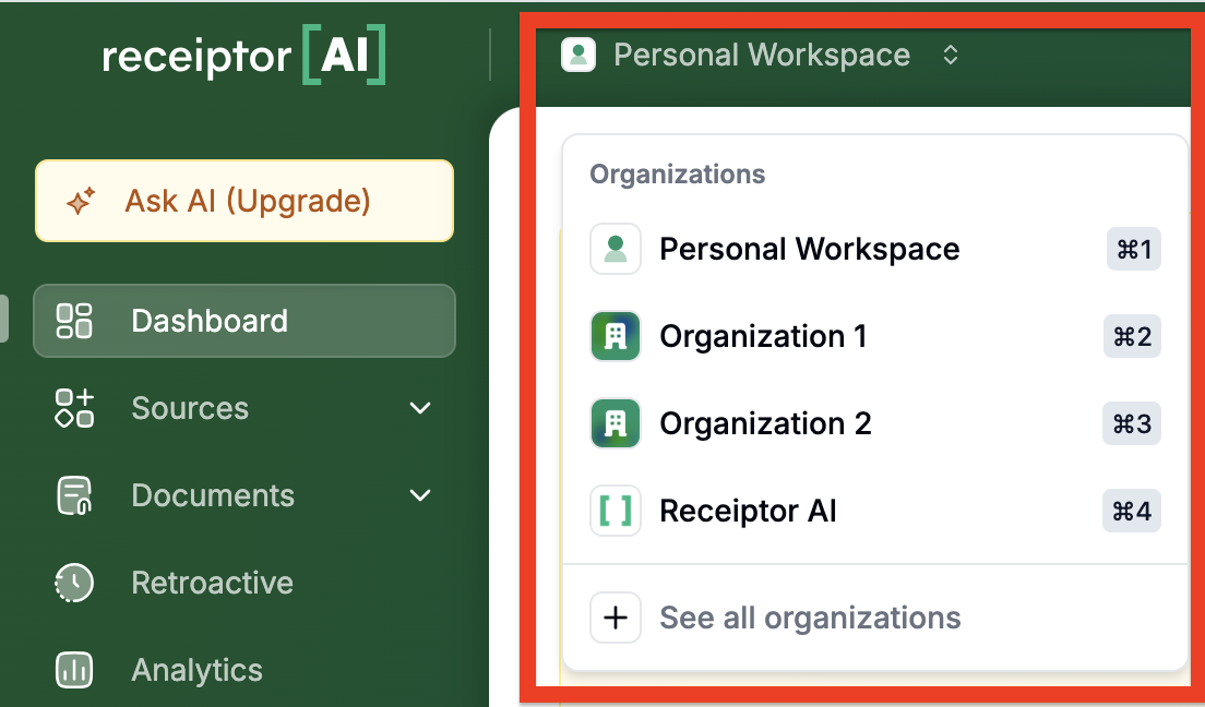 An Organization in Receiptor AI is a secure, independent workspace that acts as a container for a specific client, business entity, or department you manage. This feature is essential for accountants, bookkeepers, and users with multiple companies, as it ensures complete separation of: