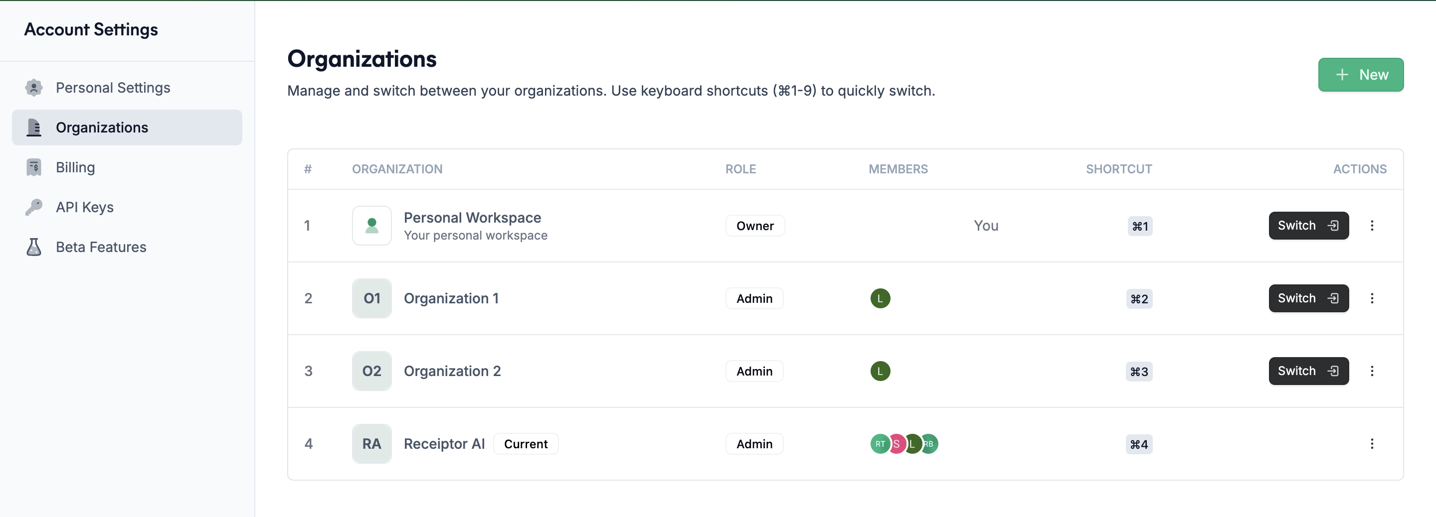 If you need help transferring documents between Organizations, setting up guest access, or managing complex multi-entity configurations, contact our support team at info@receiptor.ai.