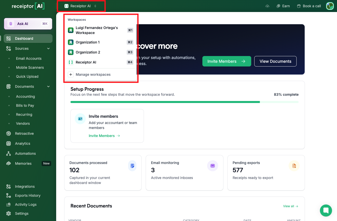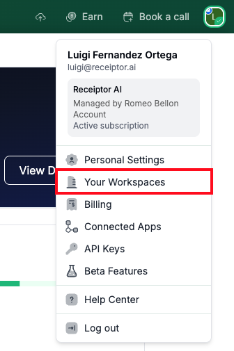 When you land on Receiptor AI, you'll see your current Workspace in the top-left corner.