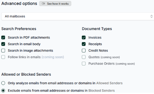 Choose the mailbox — Specify which mailbox Receiptor AI should analyze.