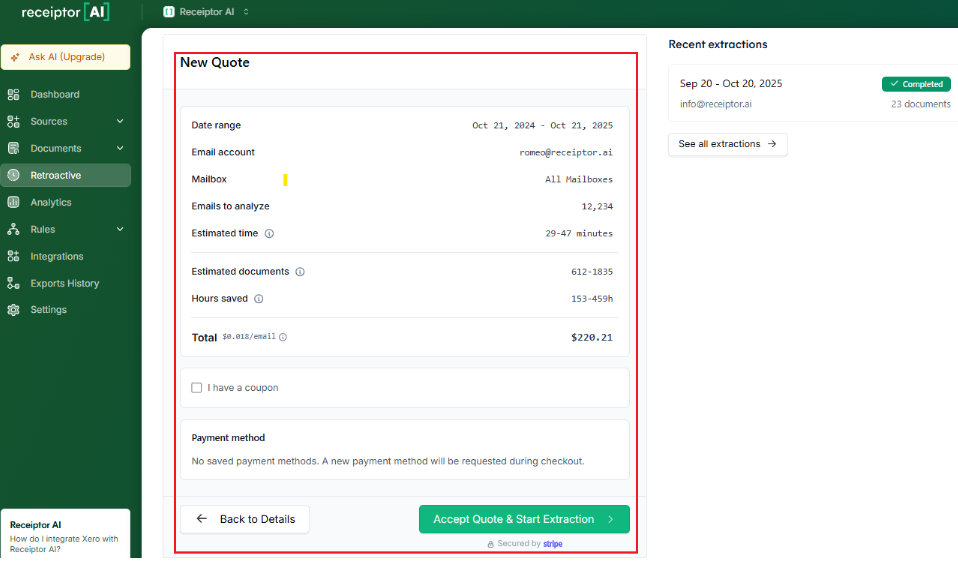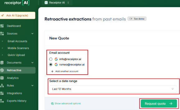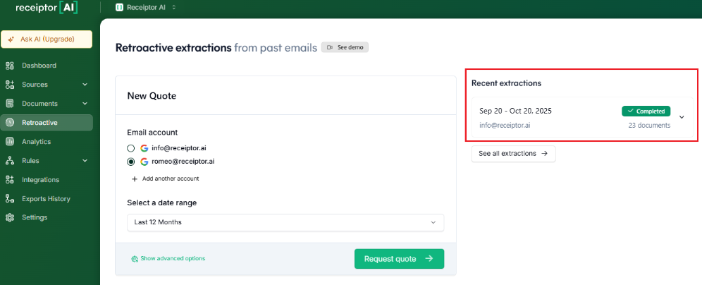 Retroactive Extraction allows users to automatically retrieve financial documents from their past emails. This functionality is handy for businesses and individuals who need to catch up on their bookkeeping or prepare for tax season by retrieving historical financial data.