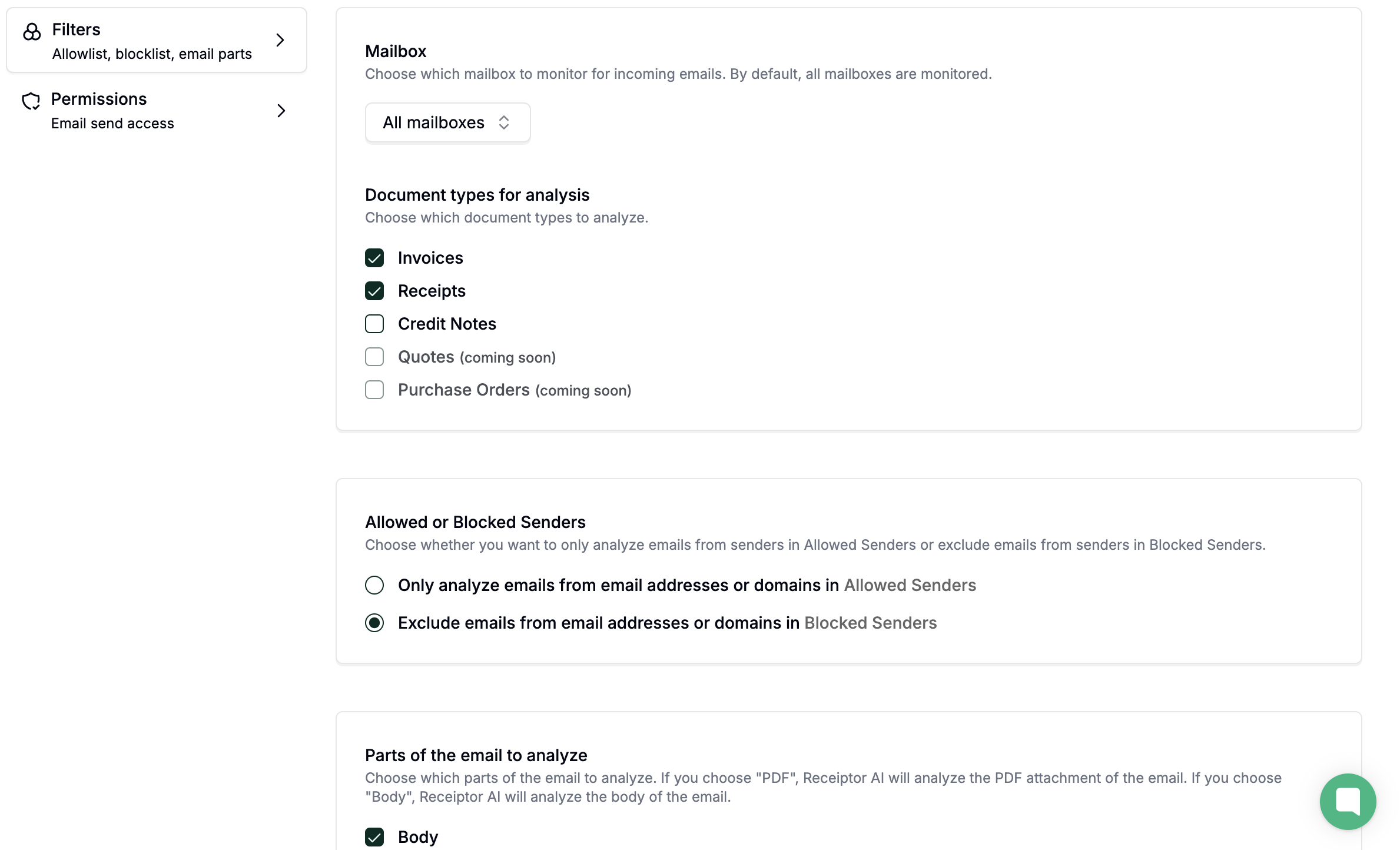 Choose the mailbox — Specify which mailbox Receiptor AI should analyze.