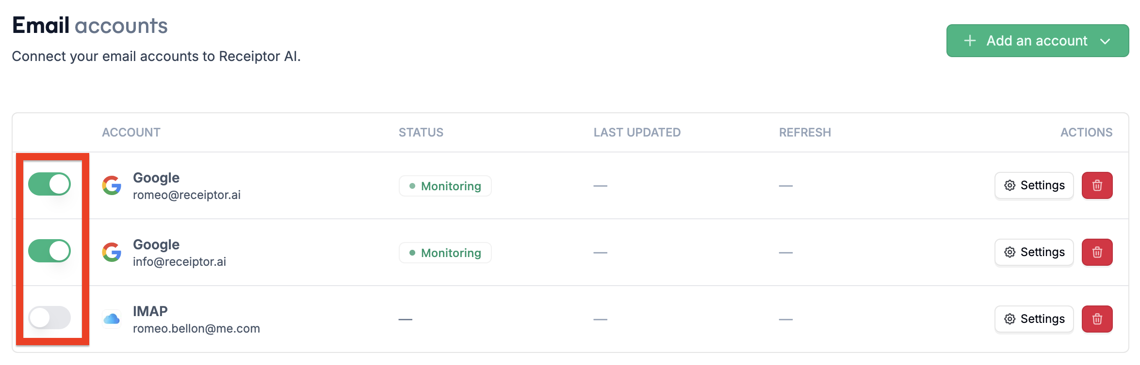 Once an email account is connected, you can activate monitoring. Hence, the system automatically scans your incoming messages in real-time, extracts any new receipts or invoices, and adds them to your Documents section.