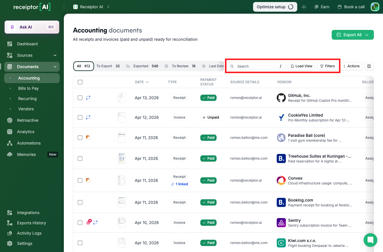 The Documents section displays all your processed documents, automatically extracted by Receiptor AI from connected sources such as email and mobile, or from manual uploads. From here, you can search, filter, label, edit, export, archive, or delete documents.