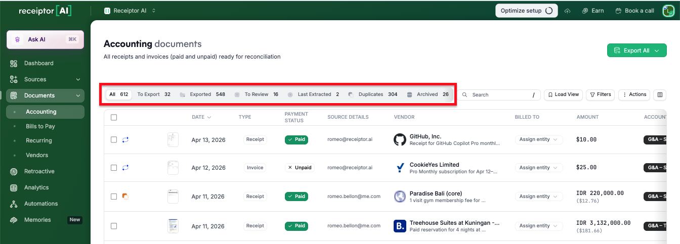 For issues related to documents not appearing in this section, check the Activity Logs first to understand why the document may have been filtered out or failed processing, or contact info@receiptor.ai for additional assistance.