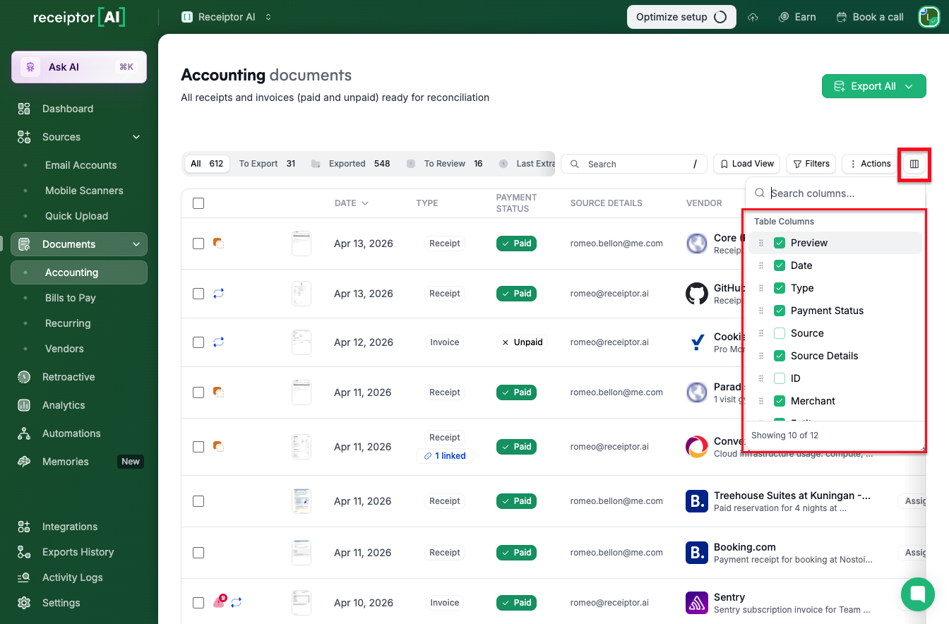 Receiptor AI displays all essential receipt and invoice data it has extracted or understood from your documents in a clear, customizable table format. It includes information about the document, its source, the merchant/vendor, and the financial transaction itself.