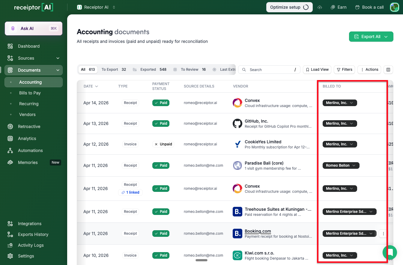 Once entities are set up, the Billed To field unlocks several workflows across Receiptor AI.