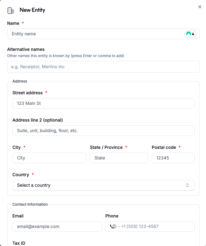 Optionally, add Aliases (alternative names the entity may appear as on documents). The more aliases you add, the more accurately the AI can match documents to this entity.