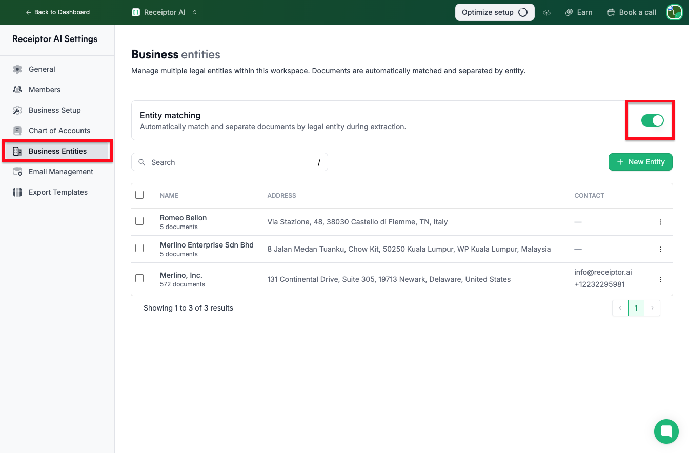 Use this feature when documents for more than one legal entity arrive in the same inbox. For example, if invoices addressed to two different companies both land in one email account, Business Entities will automatically route each document to the right entity.