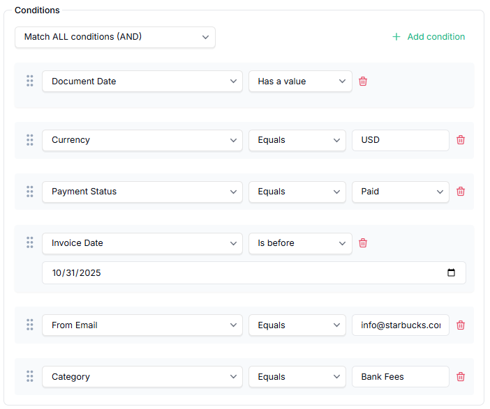 Define the Conditions. You can create conditions on all data extracted from your documents: