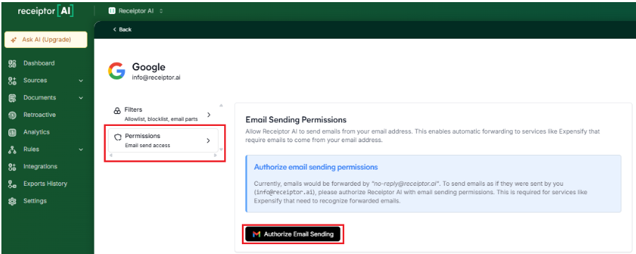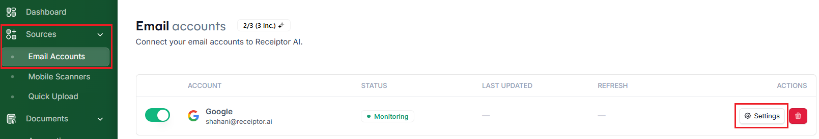 Make sure you have connected the inbox to Receiptor AI: ‘Sources’ > ‘Email Accounts’. Then go to ‘Settings’.