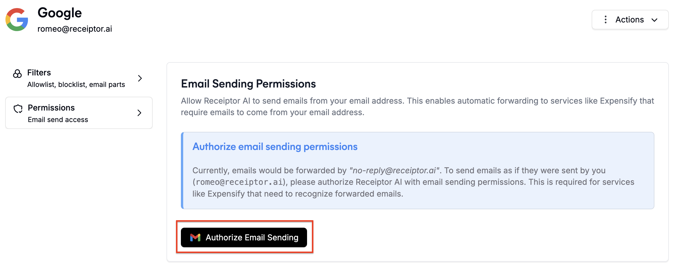 Click ‘Permissions’ and then ‘Authorize Email Sending’.