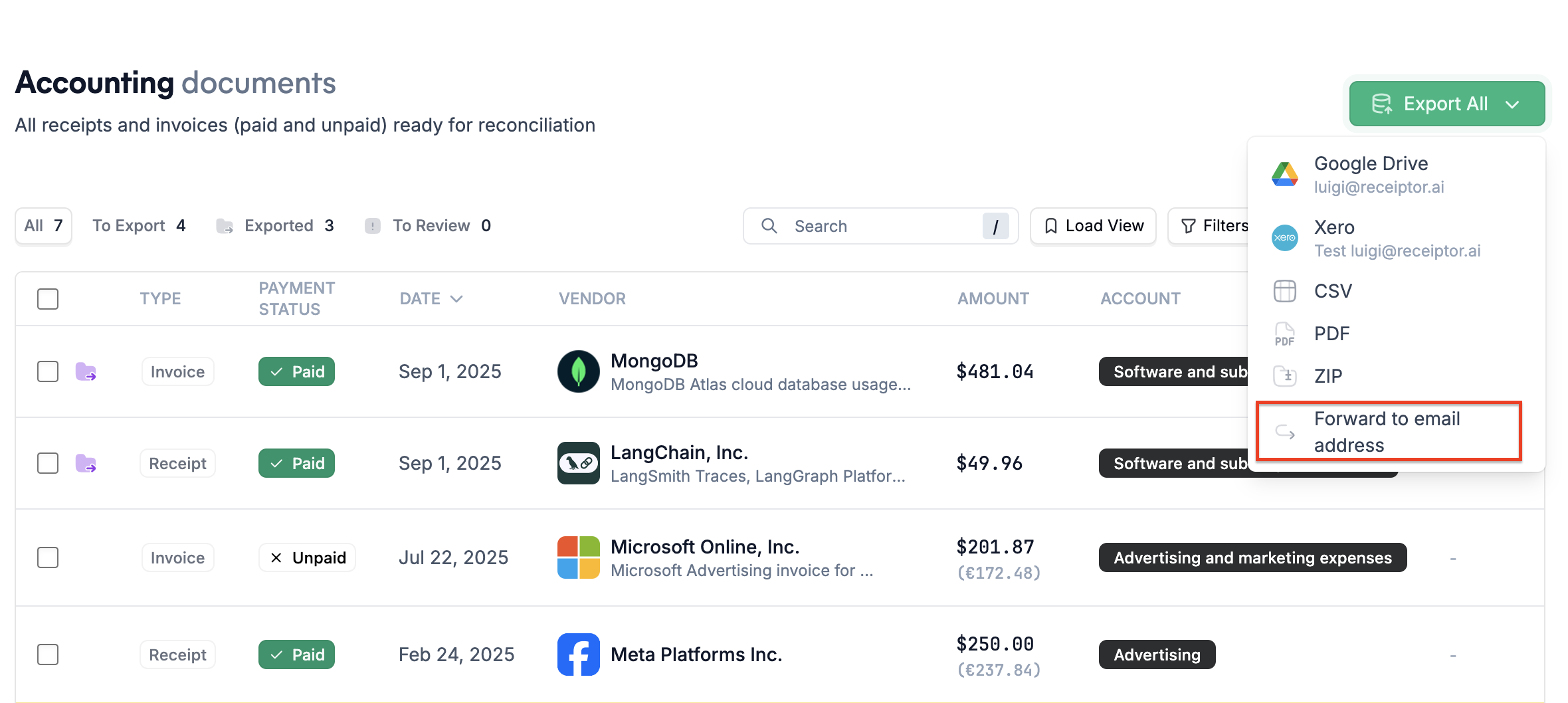 After Receiptor AI extracts your receipts and invoices, you can automatically forward them to an external destination such as your accountant or bookkeeper’s email, your finance team, or directly into your accounting system via a connected email inbox.