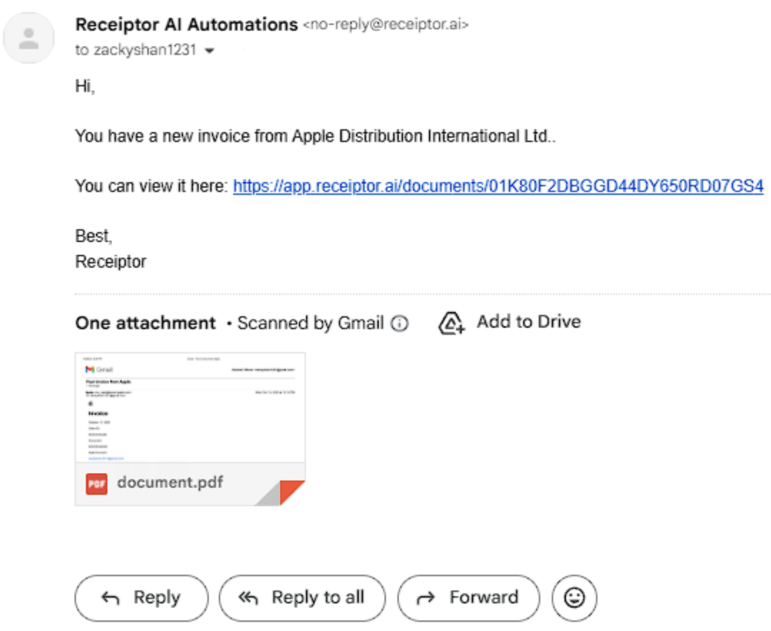 If forwarded documents are not appearing at the destination, please contact support: info@receiptor.ai