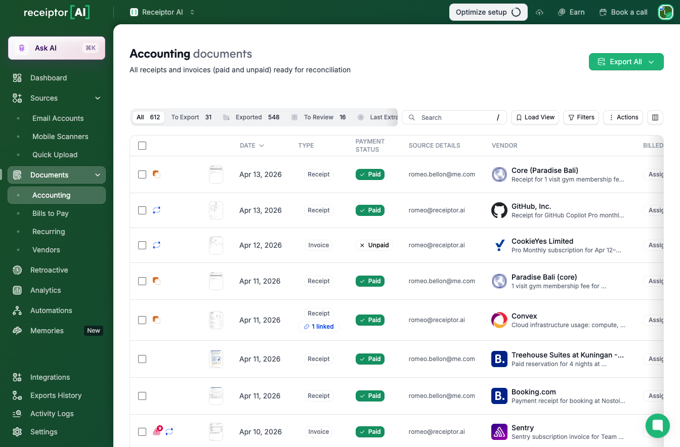 Receiptor AI processes past emails and brings historic receipts into your Documents section.