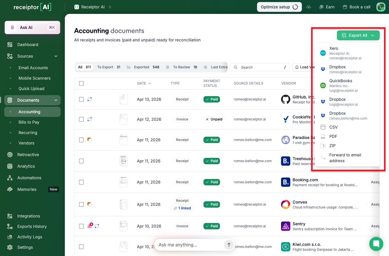 Receiptor AI continuously scans new emails to extract all relevant documents and place them in your Documents section.