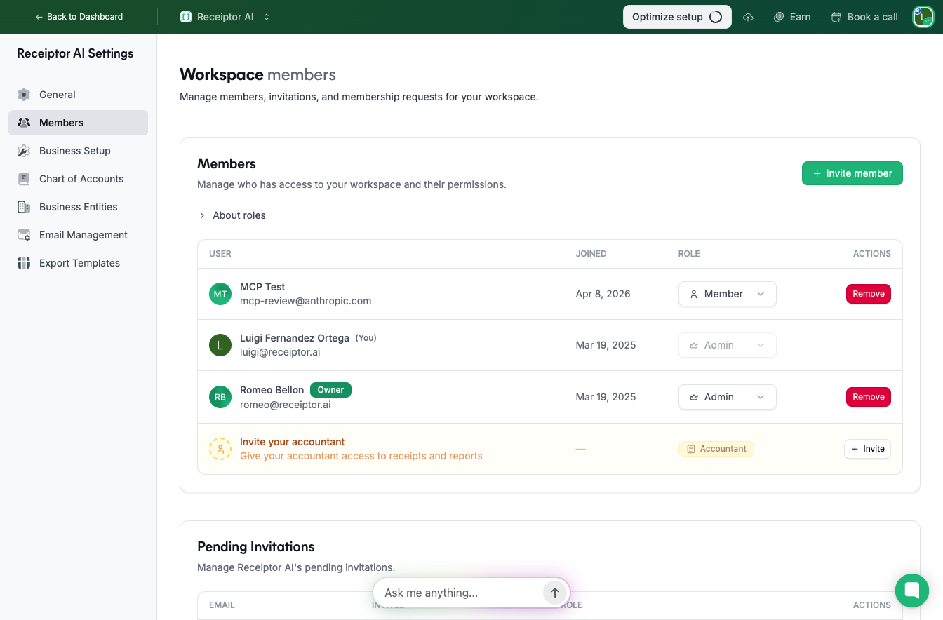If you run into issues while getting started, please contact us at info@receiptor.ai or via the in‑app chat.
