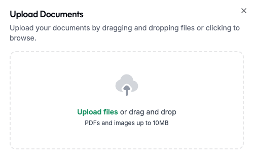 A: Supported formats include PDFs and images (JPEG, PNG) up to 10 MB each. If your documents are larger or in another format, you should export them to PDF or an image and then upload.