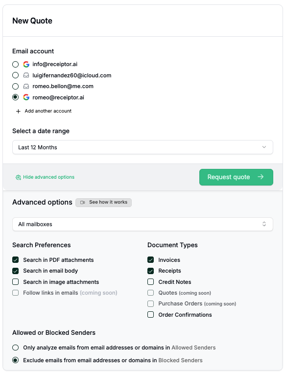 If you need to catch up on past documents, or if you’d like to test the performance of Receiptor AI directly, you can run a Retroactive Extraction, which will scan your past emails and extract all relevant documents.