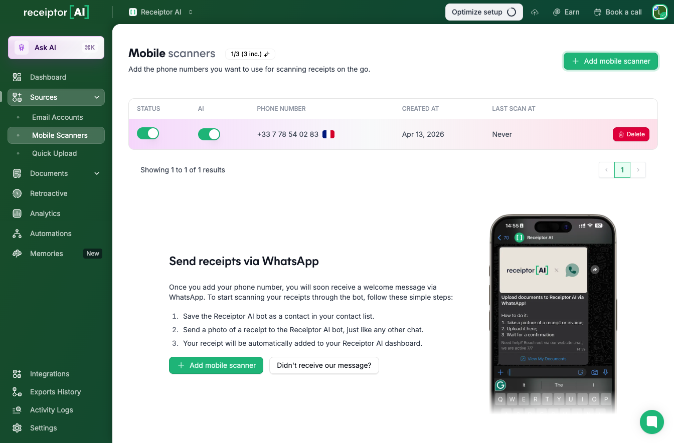 If you need to snap paper receipts or physical documents, you can add mobile scanners. It will give you access to a ‘Receiptor AI’ contact on WhatsApp, where you can send photos or documents.